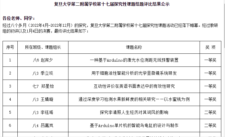 • 复旦二附校(初中部)第十六届探究性课题结题评比决赛名单公示